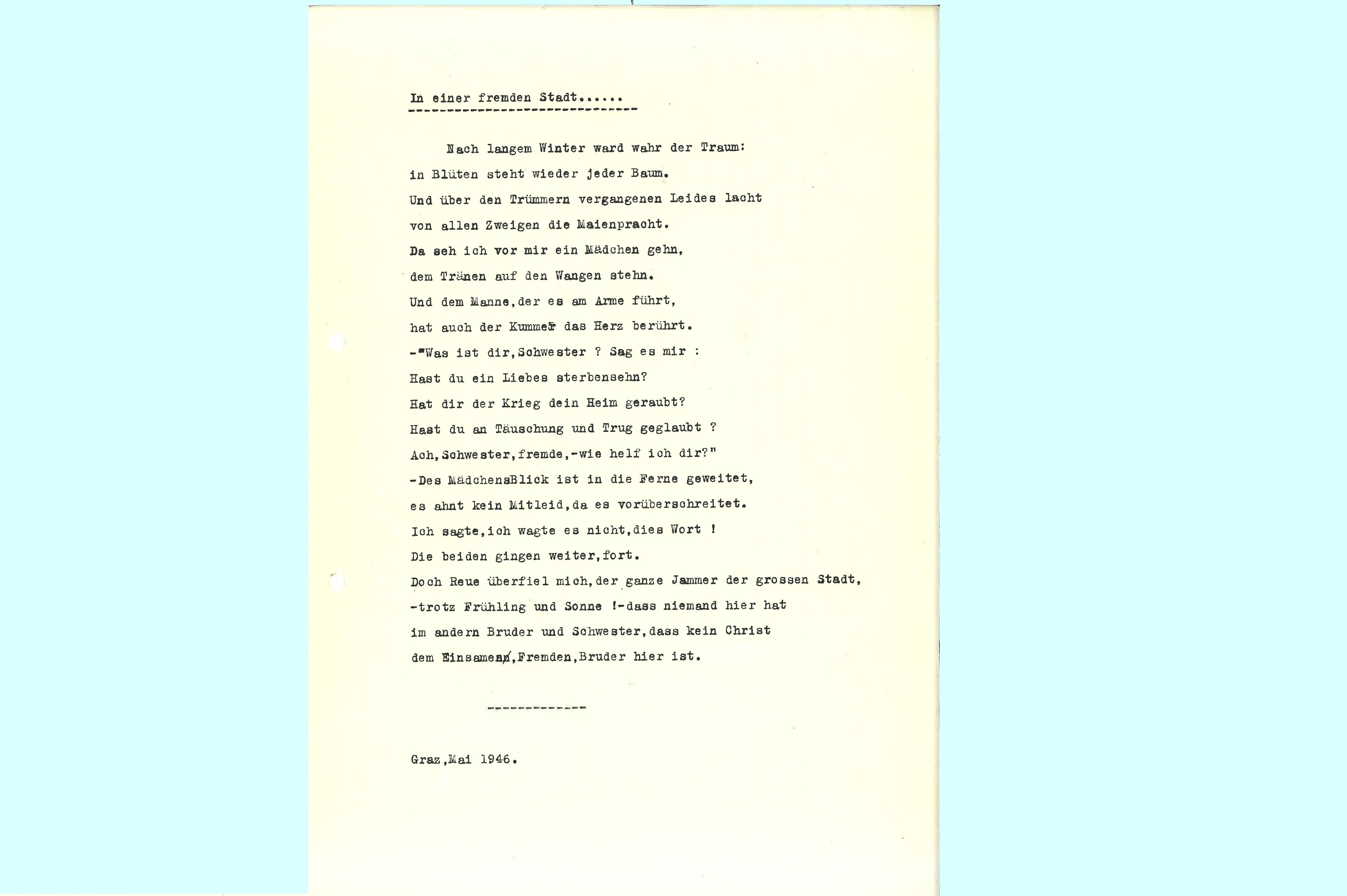 Das Gedicht In einer fremden Stadt ist auf Mai 1946 datiert und in Graz entstanden. Es ist größtenteils in Paarreimen verfasst und lebt vom Kontrast zwischen Frühling und Nachkrieg.