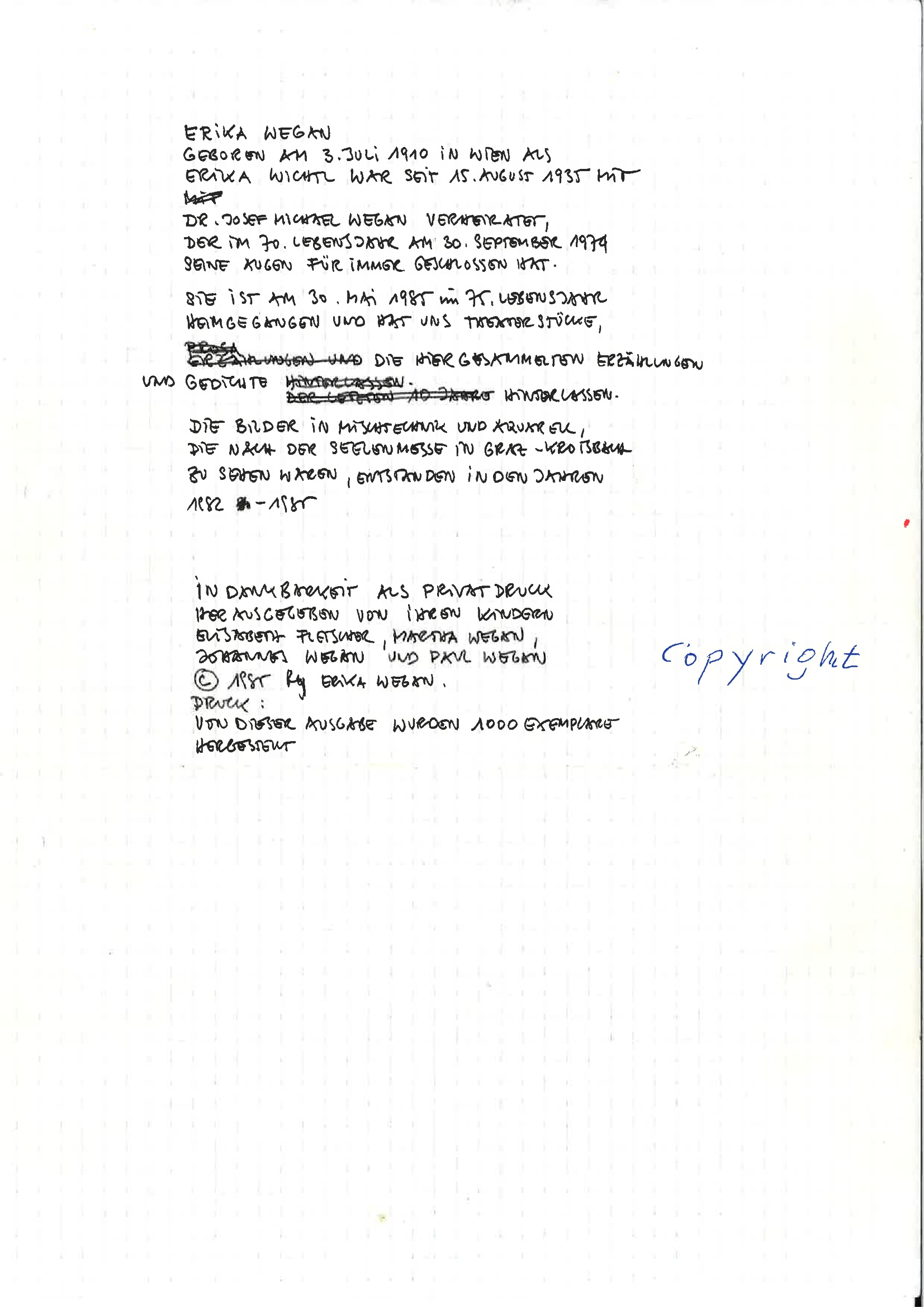 Elisabeth Fleischer, Martha Wegan, Johannes Wegan und Paul Wegan (Hrsg.): Erika Wegan 1974–1985. [Privatdruck] Graz: Khil 1985.