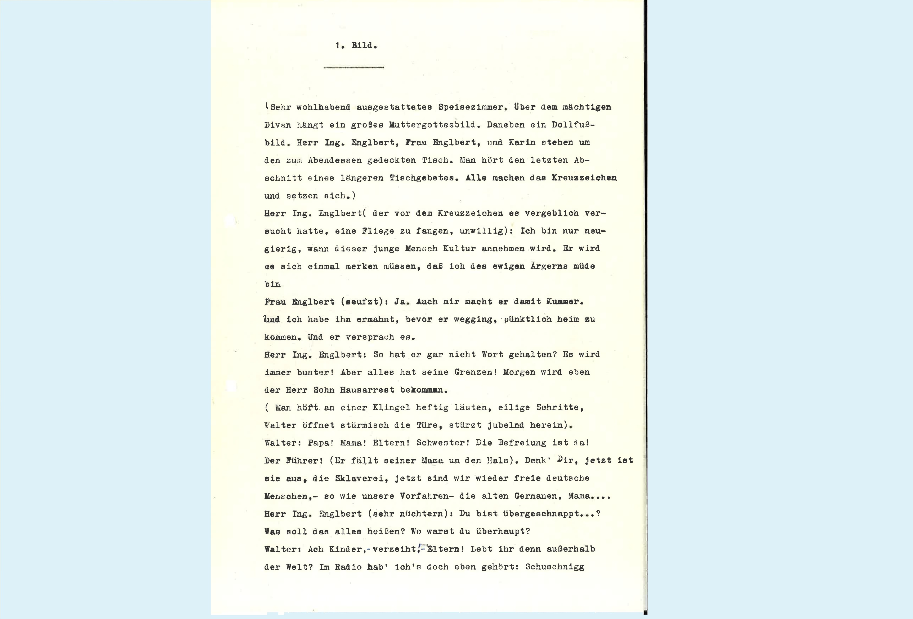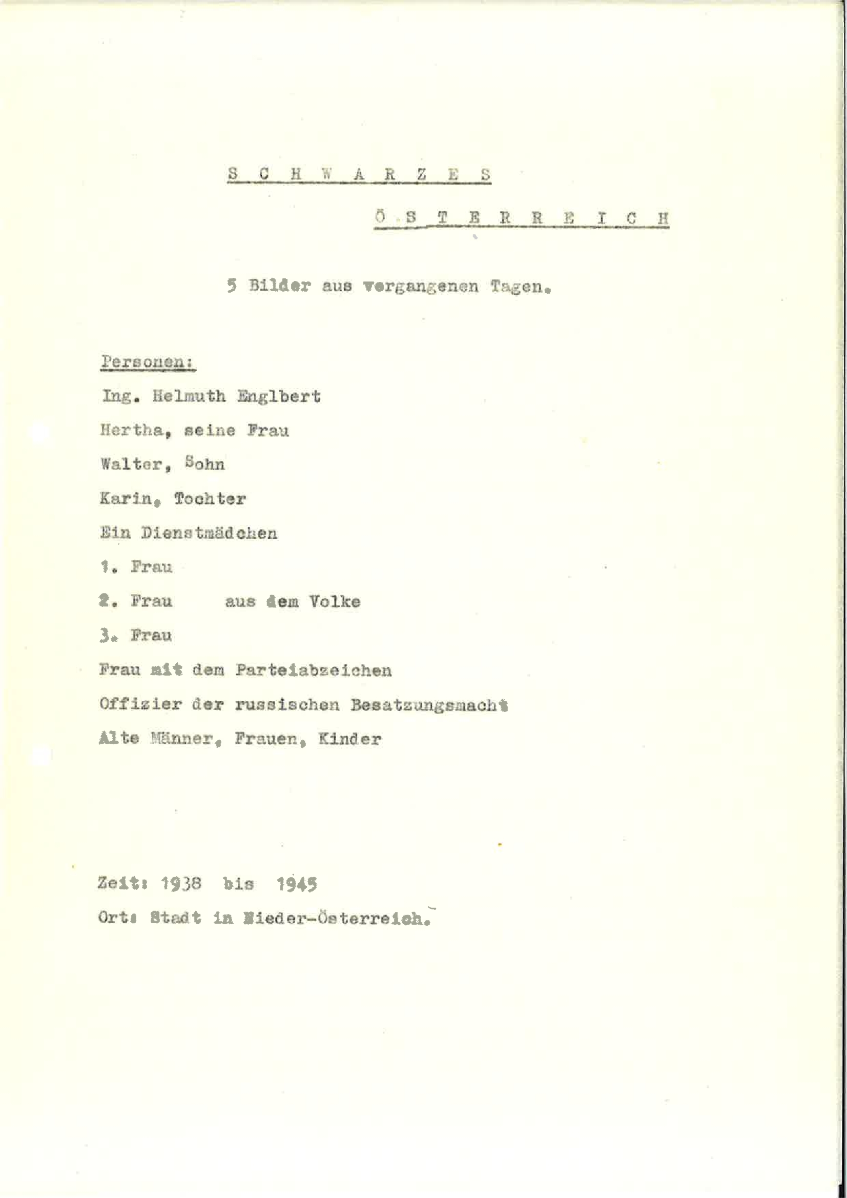 Erika Wegan: Schwarzes Österreich. 5 Bilder aus vergangenen Tagen. FNI-WEGAN. 1.2. Schwarzes Österreich. Typoskript auf glattem Durchschlagpapier, 30 Bl., davon Bl. II und Bl. 1.
